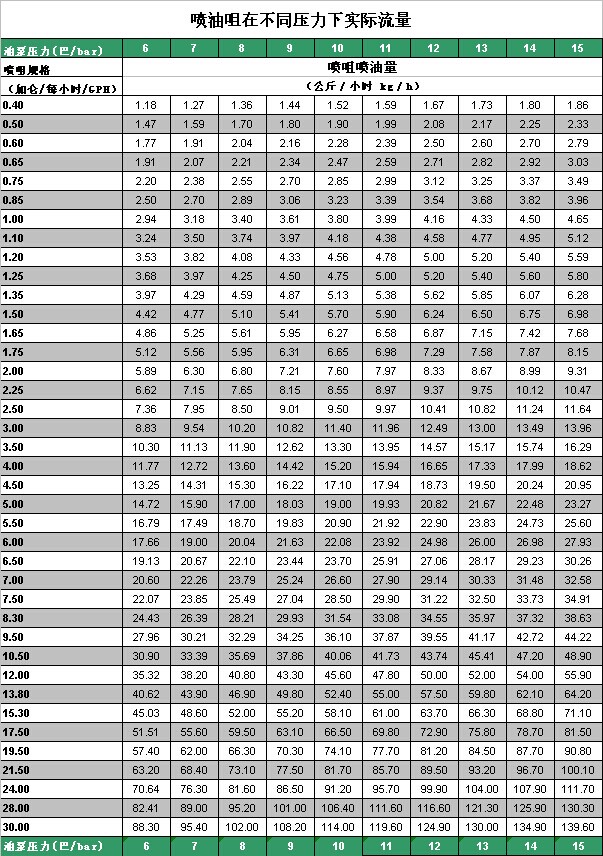 同一噴咀在不同壓力下會有不同的流量,隨著油泵壓力的增加和噴嘴規格的增大,噴油量不斷增加。根據香蕉网址在线观看器使用的噴嘴規格和設定的油泵壓力,從下表中即可找到噴油量,並計算出香蕉网址在线观看器相應的出力(KW)。